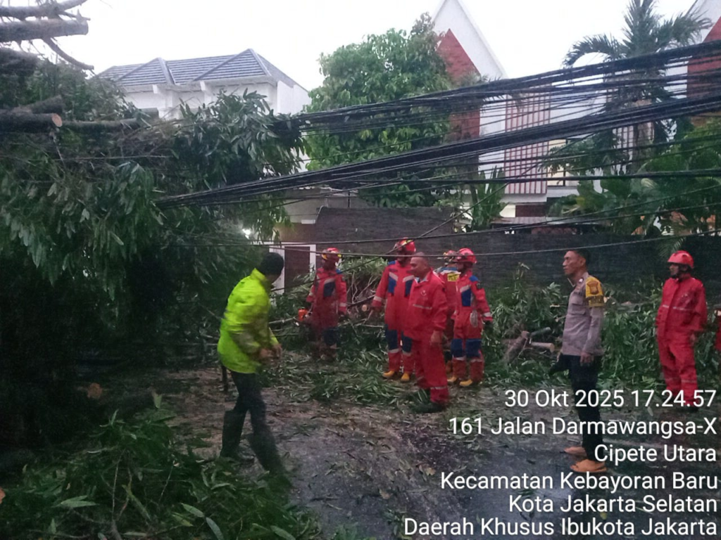 Jakarta Selatan — Curah hujan deras yang mengguyur wilayah Kebayoran Baru pada Kamis sore (30/10/2025) sekitar pukul 15.30 WIB menyebabkan sejumlah pohon tumbang dan genangan air di beberapa titik jalan. Ada beberapa mobil yang terjebak .Salah satu lokasi terdampak cukup parah terjadi di Jalan Dharmawangsa X, Kelurahan Cipete Utara, Kecamatan Kebayoran Baru.